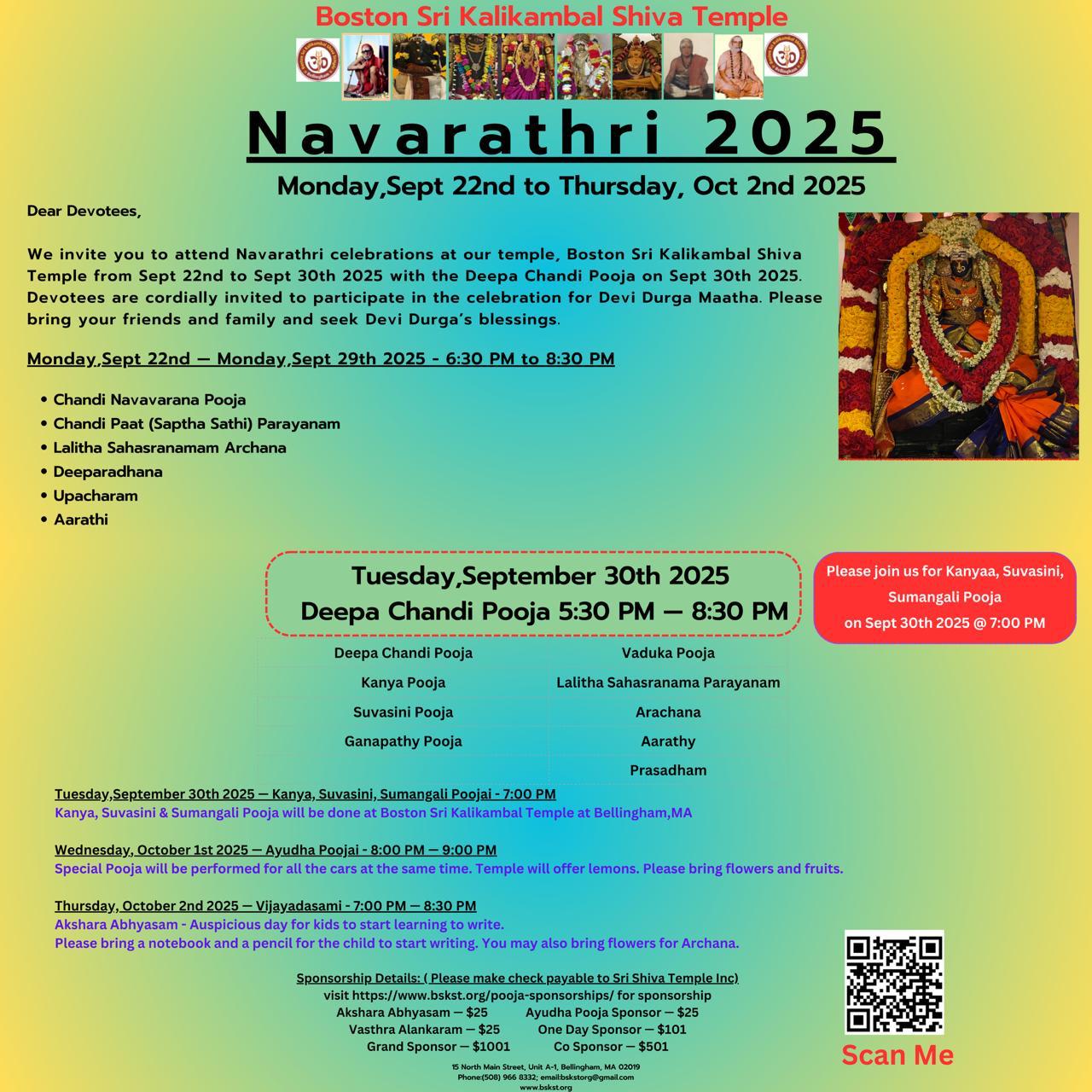 Temple Timings Sunday to Saturday 5:30 PM to 8:30 PM For Navarathri Sponsorship click here To sponsor for the new temple click GO TASK Om Nama Shivaya!