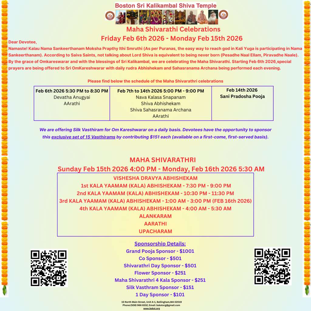 Temple Timings Sunday to Saturday 5:30 PM to 8:30 PM To sponsor for the new temple click GO TASK Om Nama Shivaya!